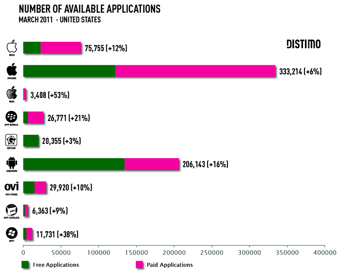 A Julio de 2011 existen 425,000 apps, de las que se han producido 15.000 millones de descargas y un beneficio total de 3.600 millones de dolares.